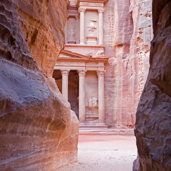We're going to spend today exploring Petra – a 'rose-red' city carved by the Nabateans out of vast cliffs, which we'll reach via a journey along the Siq. The excitement builds as we walk through this long, narrow gorge, which is an experience in itself as the colours and formations of the rocks that tower above us are incredible. After walking 1km, we are rewarded with the sight of the Treasury building, which is almost perfectly preserved and features ornate carvings on its facade.